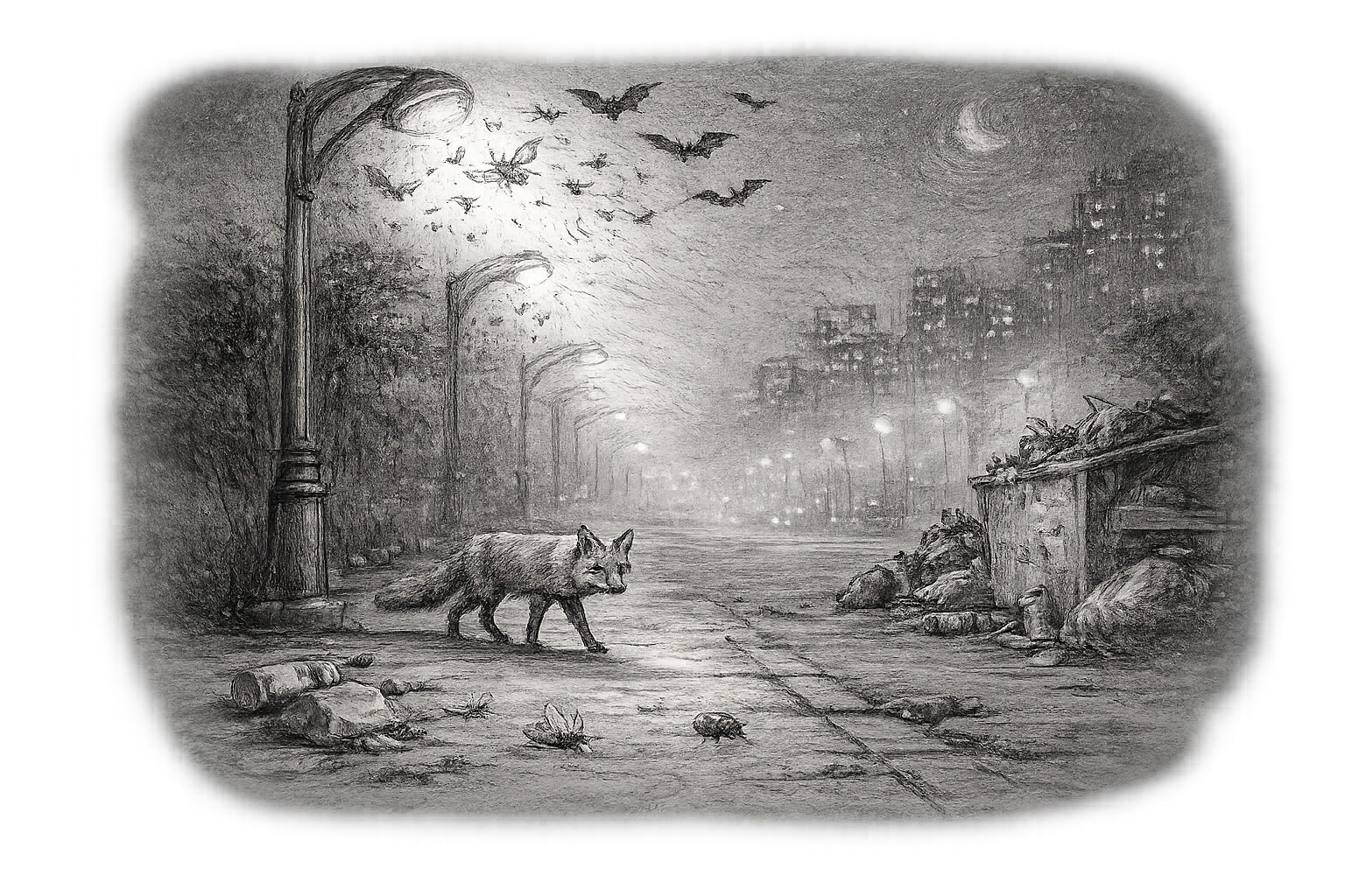 In the halo, the air is alive… but with a trapped kind of life. Insects spiral stubbornly, as if magnetized. Some collide and fall; others drop, take off again, return, and return. Immense energy spent for nothing. On the ground, a few tiny bodies already still, unseen by anyone who doesn’t look closely. It seems like a small detail. And yet it’s a key scene: here, night is no longer a habitat. It’s a trap.
